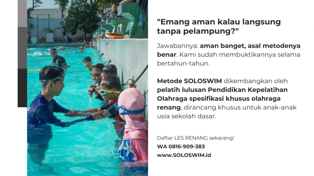Di sinilah keunggulan metode SOLOSWIM: anak belajar langsung dengan tubuhnya sendiri, sehingga hasil latihan punya risiko gagal seminimal mungkin.