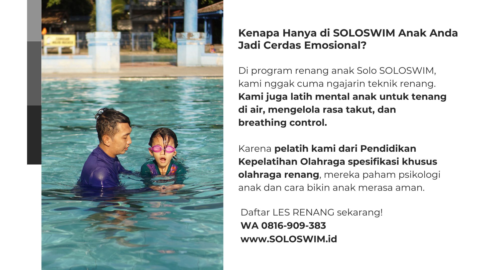 Di SOLOSWIM, kami melatih anak di kolam renang milik pasukan elit nomor satu se-Indonesia yaitu Kopassus Kartasura dengan fasilitas kolam yang kedalaman beragam mulai 0,5 sampai 2 hingga 5 meter. Kami selalu monitor suhu air dan durasi latihan. Kalau anak mulai kedinginan, langsung istirahat, nggak ada kompromi.