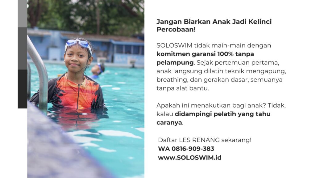 Ini bukan cerita fiktif. Ini kejadian nyata yang sering kami temui di les renang Solo SOLOSWIM selama lebih dari 15 tahun melatih ribuan anak. Dan inilah yang membuat kami geram: terlalu banyak program renang yang menjadikan anak sebagai kelinci percobaan dengan metode asal-asalan. Target jelas: anak mandiri di kolam dalam. Kenyataan? Stagnan, dimanja pelampung tanpa kesudahan.