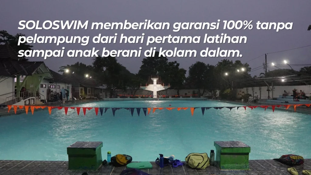 Ayah Bunda, sudah saatnya berhenti ragu dan mulai bertindak. SOLOSWIM memberikan garansi 100% tanpa pelampung dengan metode khusus yang sudah terbukti selama lebih dari 15 tahun melatih ribuan anak usia 7-12 tahun.